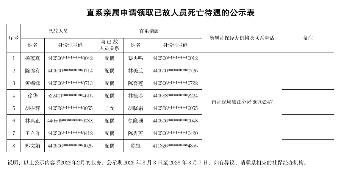 市社保局濠江分局《直系亲属申请领取已故人员死亡待遇的公示表》(2026.03.03)