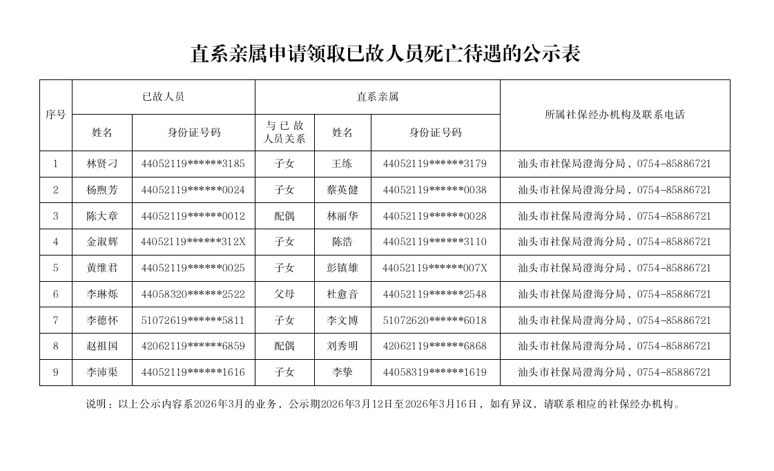 市社保局澄海分局《直系亲属申请领取已故人员死亡待遇的公示表》(2026.03.12)