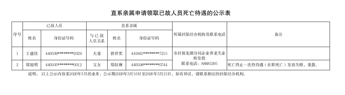 市社保局龙湖分局《直系亲属申请领取已故人员死亡待遇的公示表》(2026.03.16)
