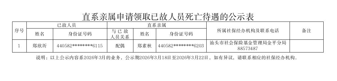 市社保局金平分局《直系亲属申请领取已故人员死亡待遇的公示表》(2026.03.18)