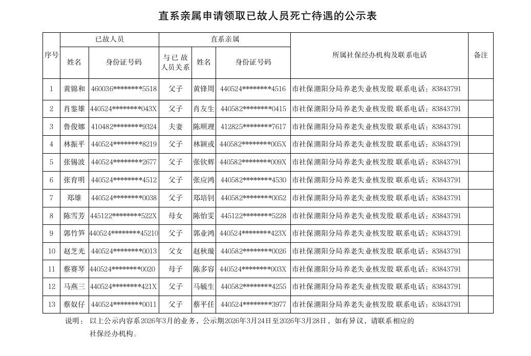 市社保局潮阳分局《直系亲属申请领取已故人员死亡待遇的公示表》(2026.03.24)