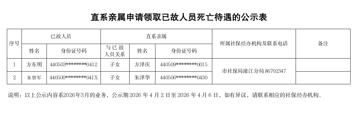 市社保局濠江分局《直系亲属申请领取已故人员死亡待遇的公示表》(2026.04.02)