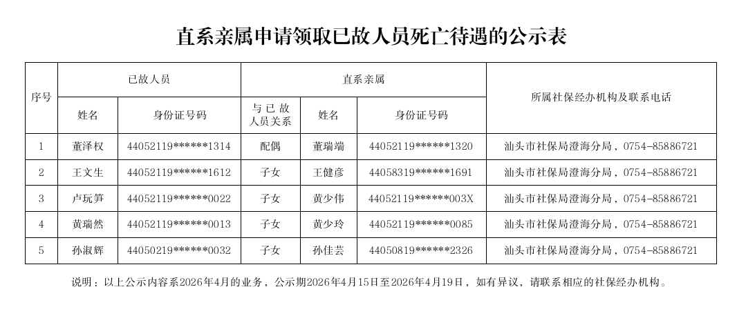 市社保局澄海分局《直系亲属申请领取已故人员死亡待遇的公示表》(2026.04.15)