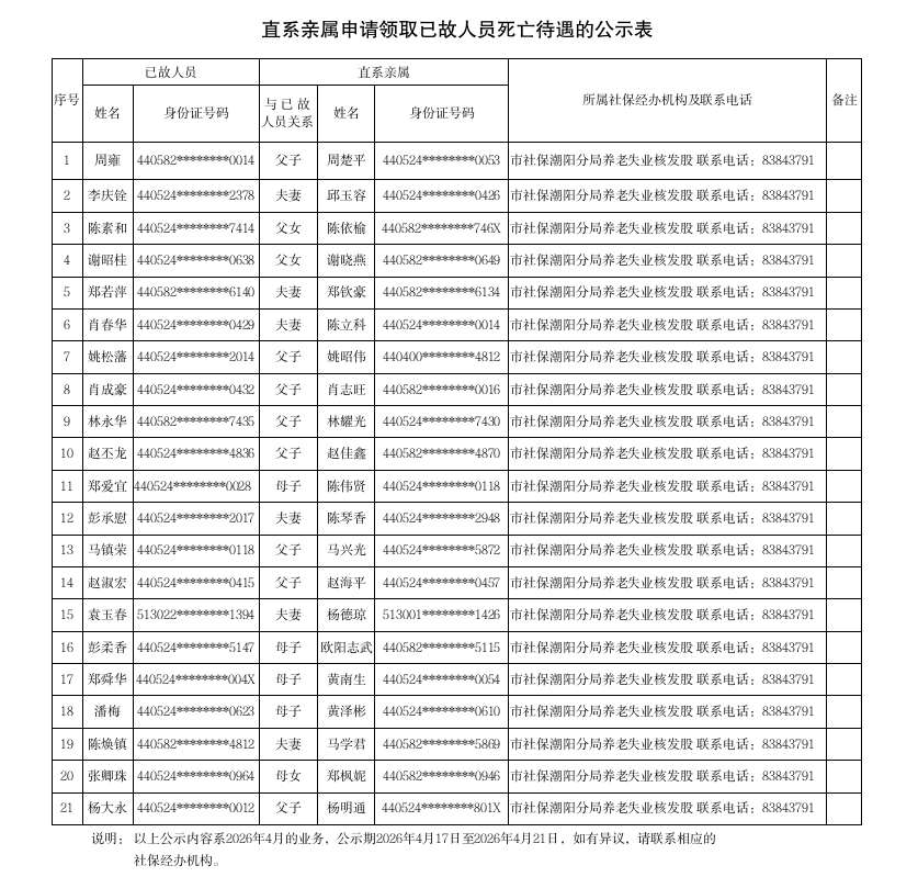 市社保局潮阳分局《直系亲属申请领取已故人员死亡待遇的公示表》(2026.04.17)