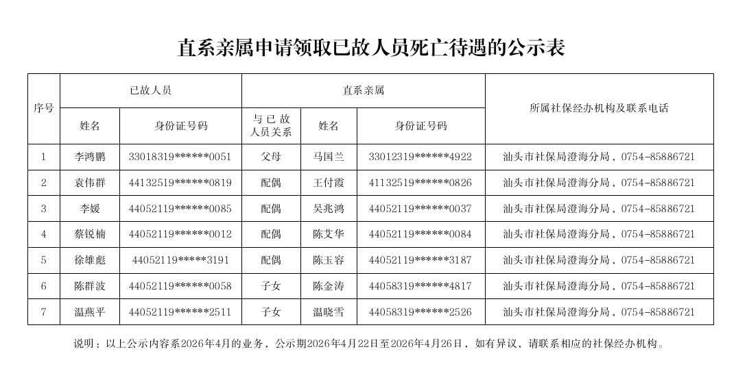 市社保局澄海分局《直系亲属申请领取已故人员死亡待遇的公示表》(2026.04.22)