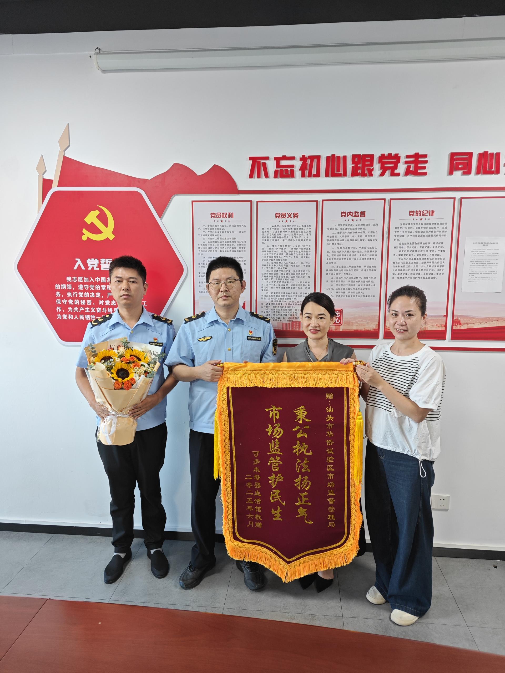 近日,汕头市市场监管局华侨试验区分局迎来一份暖心的认可与激励。辖区经营者林女士将一面绣有“秉公执法扬正气,市场监管护民生”的锦旗送至分局,以此表达对分局在市场监管工作中展现出的公正、专业和担当精神的高度赞誉与由衷感谢。