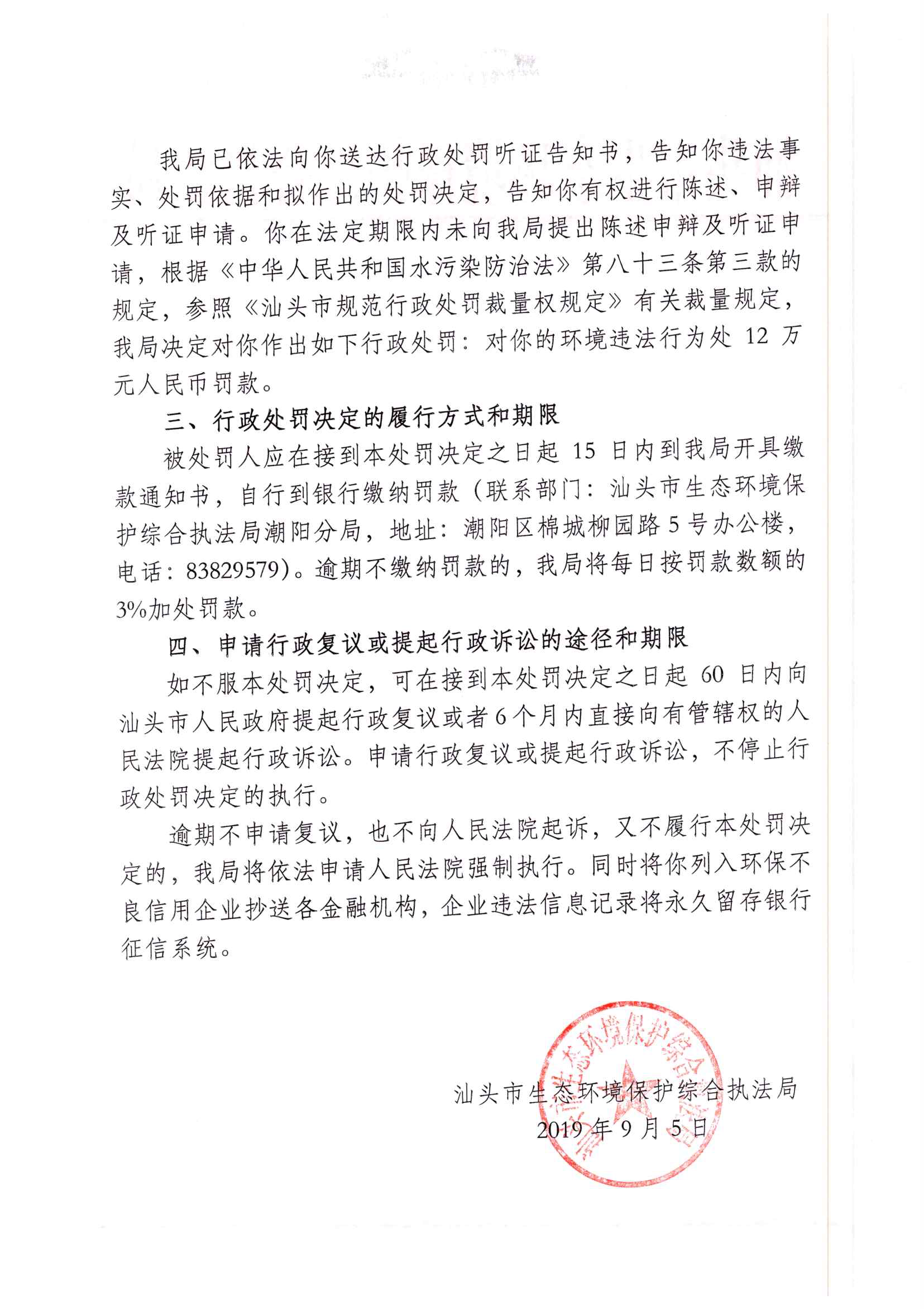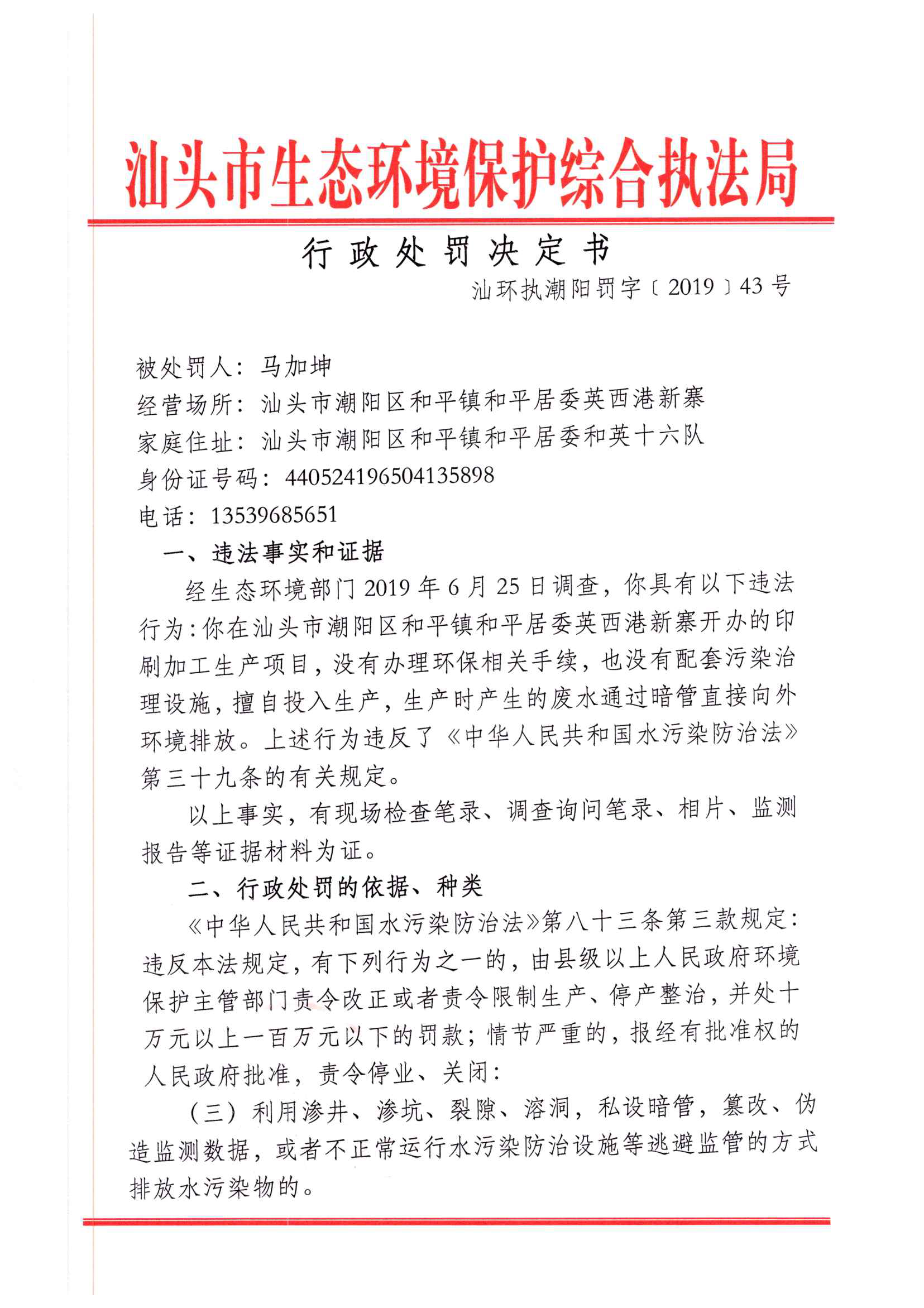 行政处罚决定书(汕环执潮阳罚字[2019]43号)