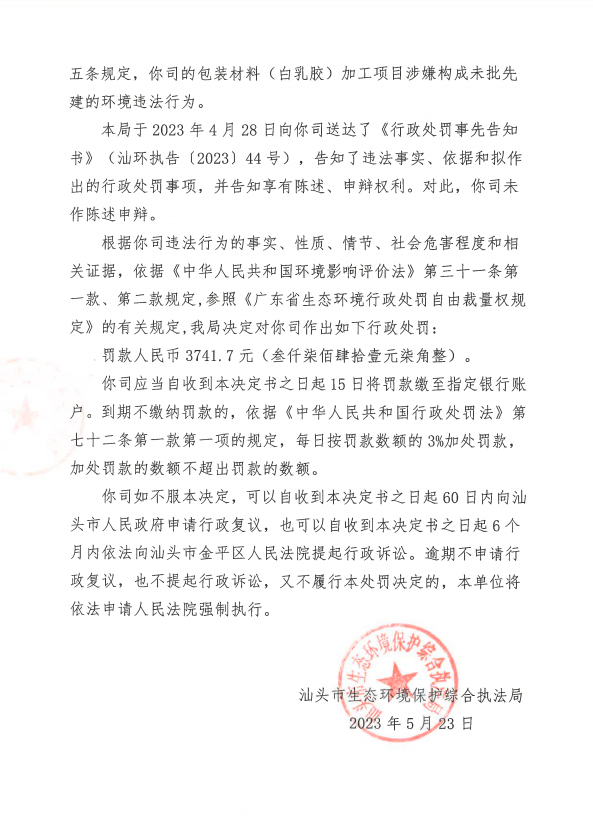 【潮南】行政处罚决定书(汕环执罚〔2023〕55号)