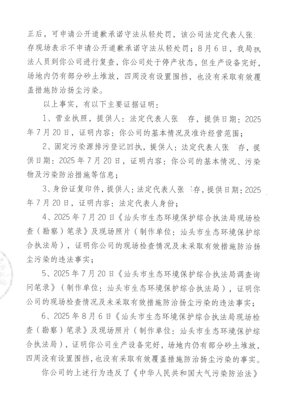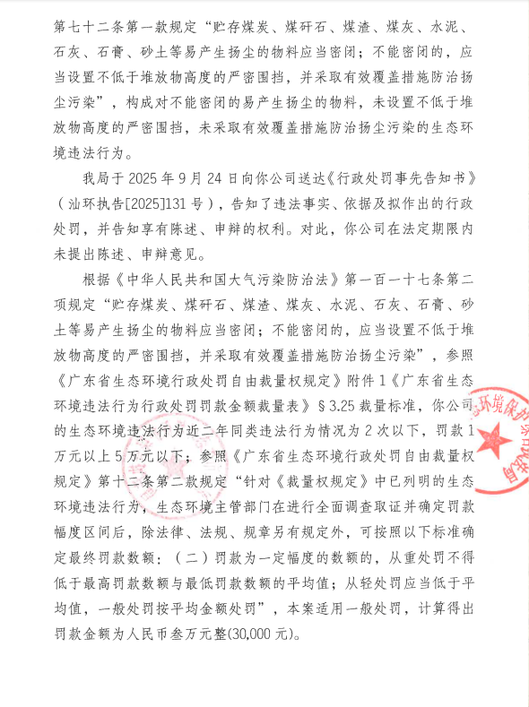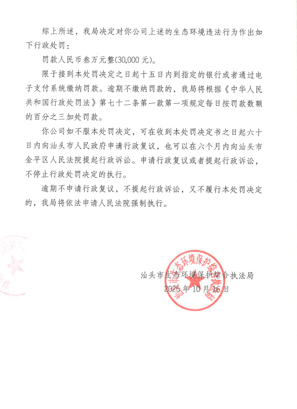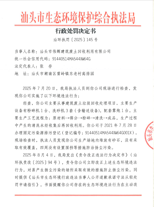 【潮南】行政处罚决定书(汕环执罚〔2025〕145号)