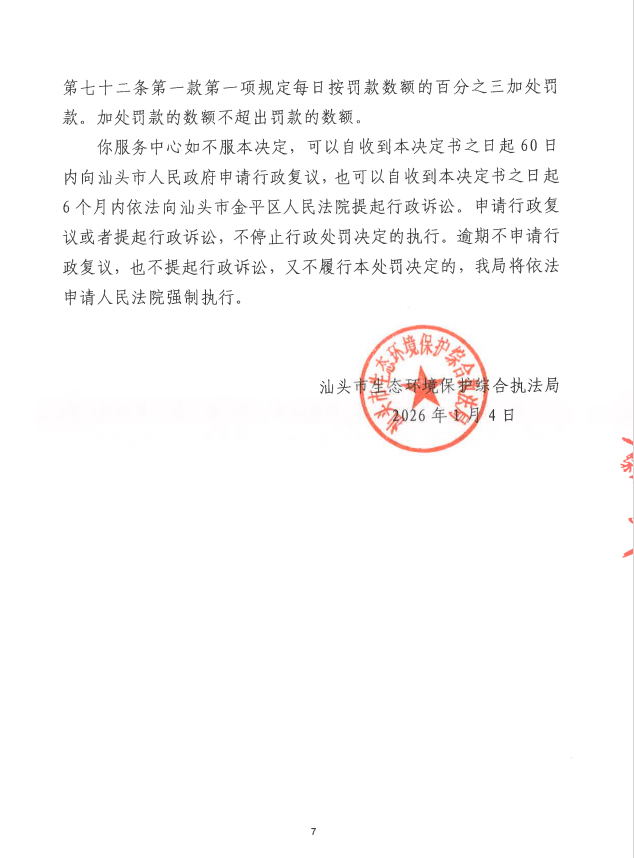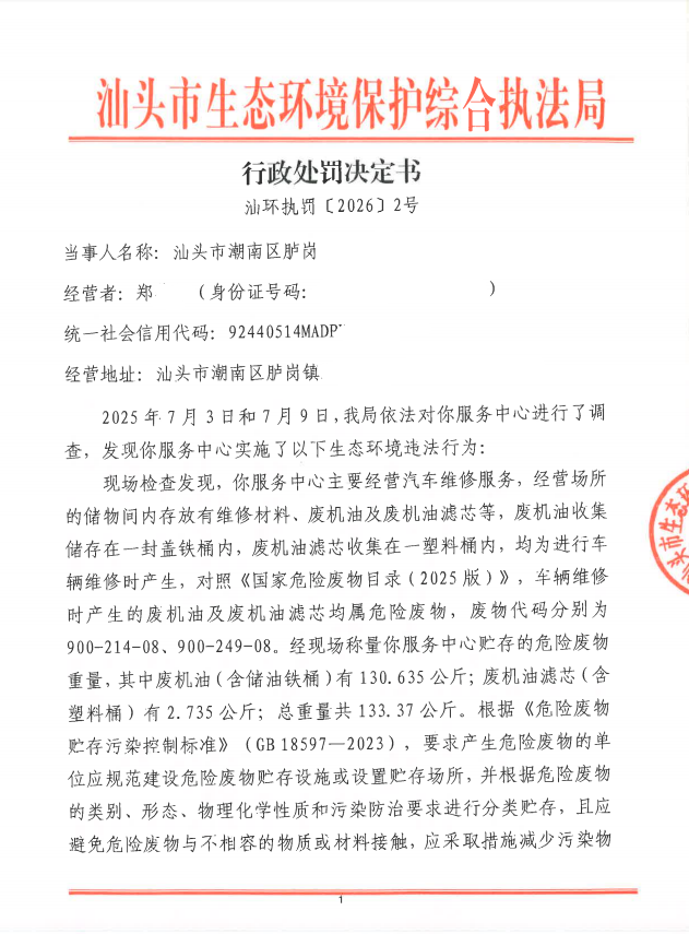 行政处罚决定书(汕环执罚〔2026〕2号)