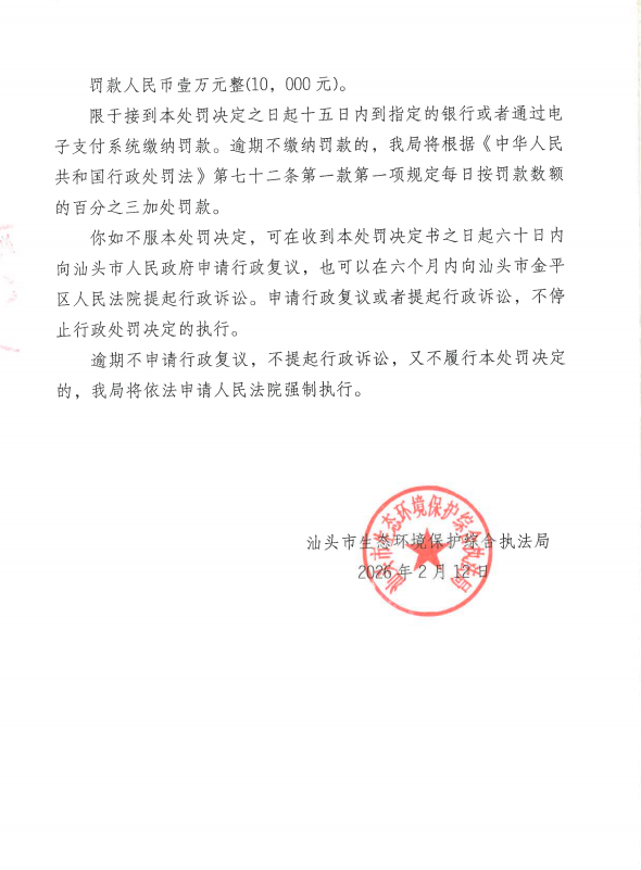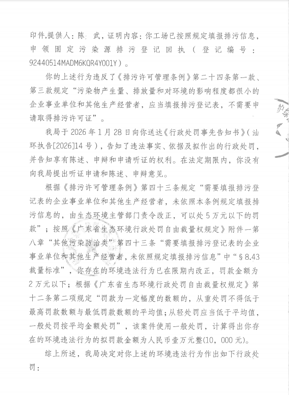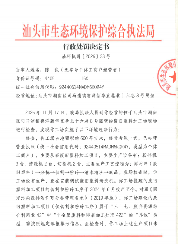 【潮南】行政处罚决定书(汕环执罚〔2026〕23号)