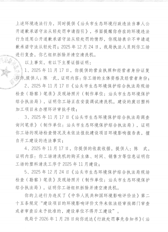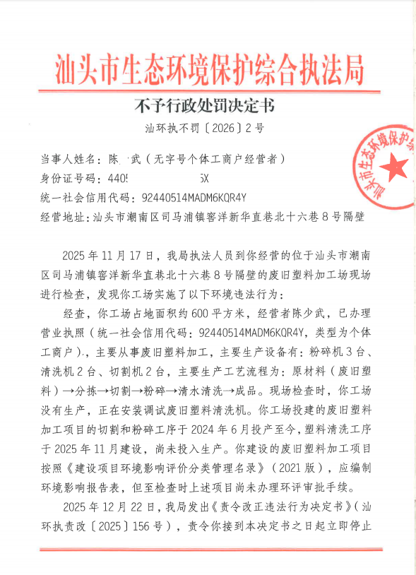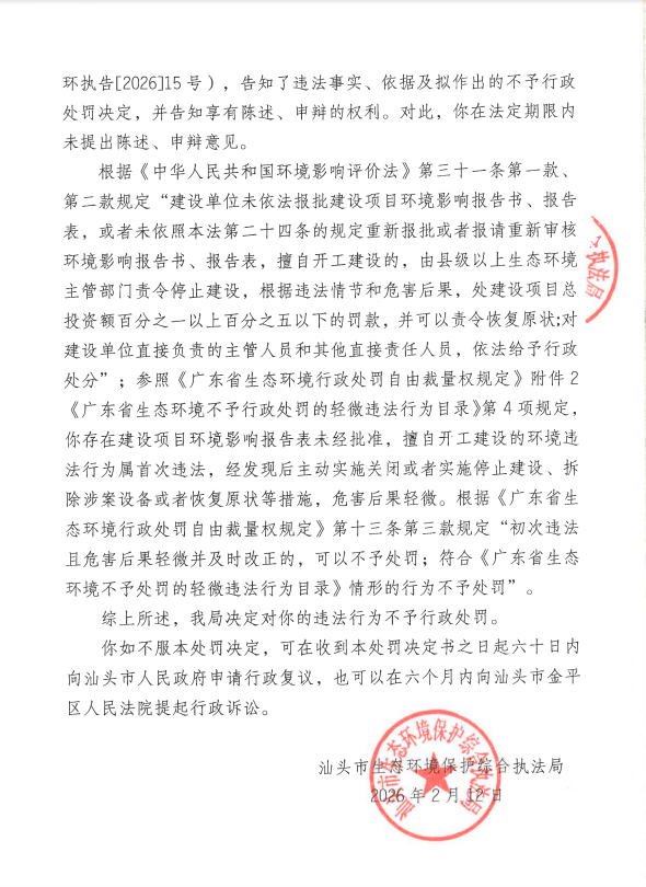 【潮南】不予行政处罚决定书(汕环执不罚〔2026〕2号)