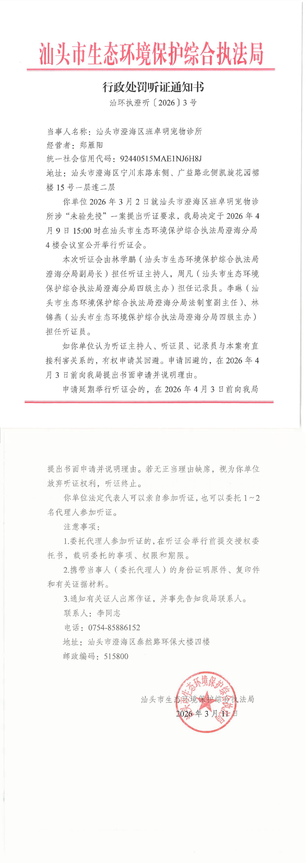 【澄海】行政处罚听证通知书(汕环执澄听〔2026〕3号)