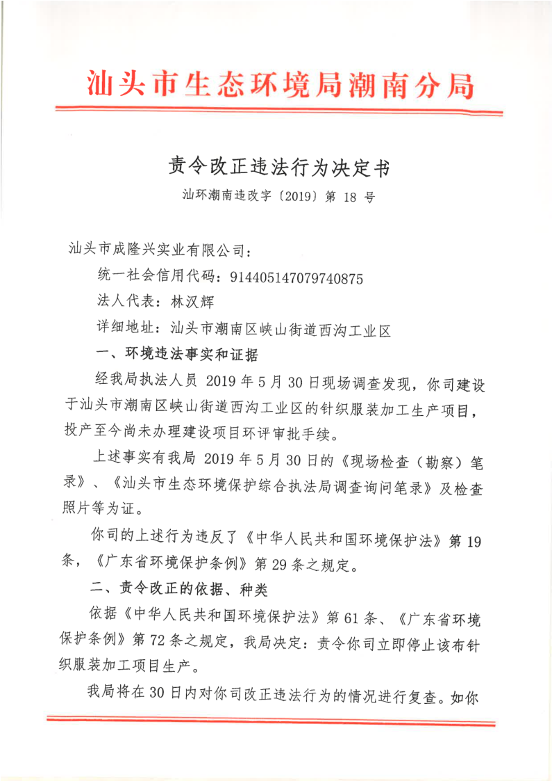 责令改正违法行为决定书(汕环潮南违改字(2019)第18号).pdf