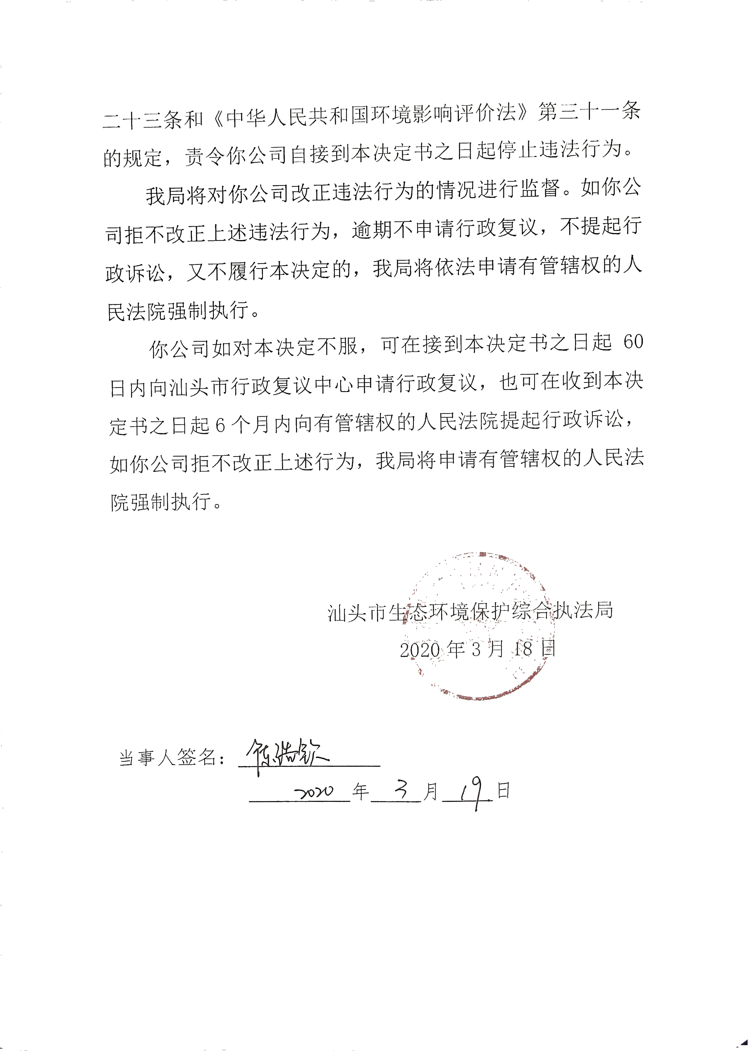【潮阳】责令改正违法行为决定书(汕环执责改〔2020〕39号)