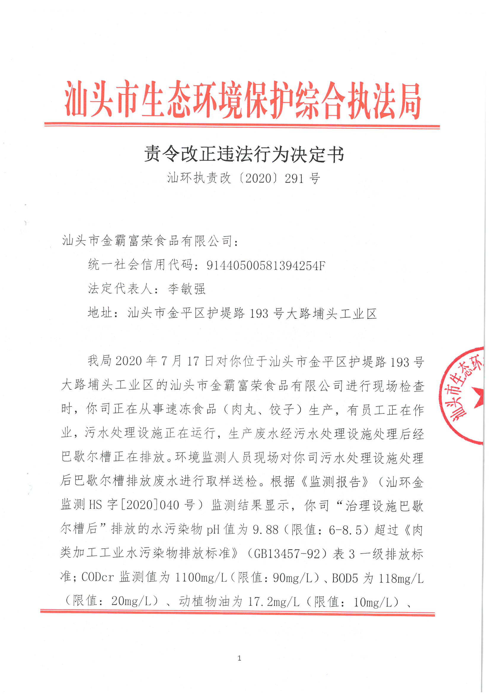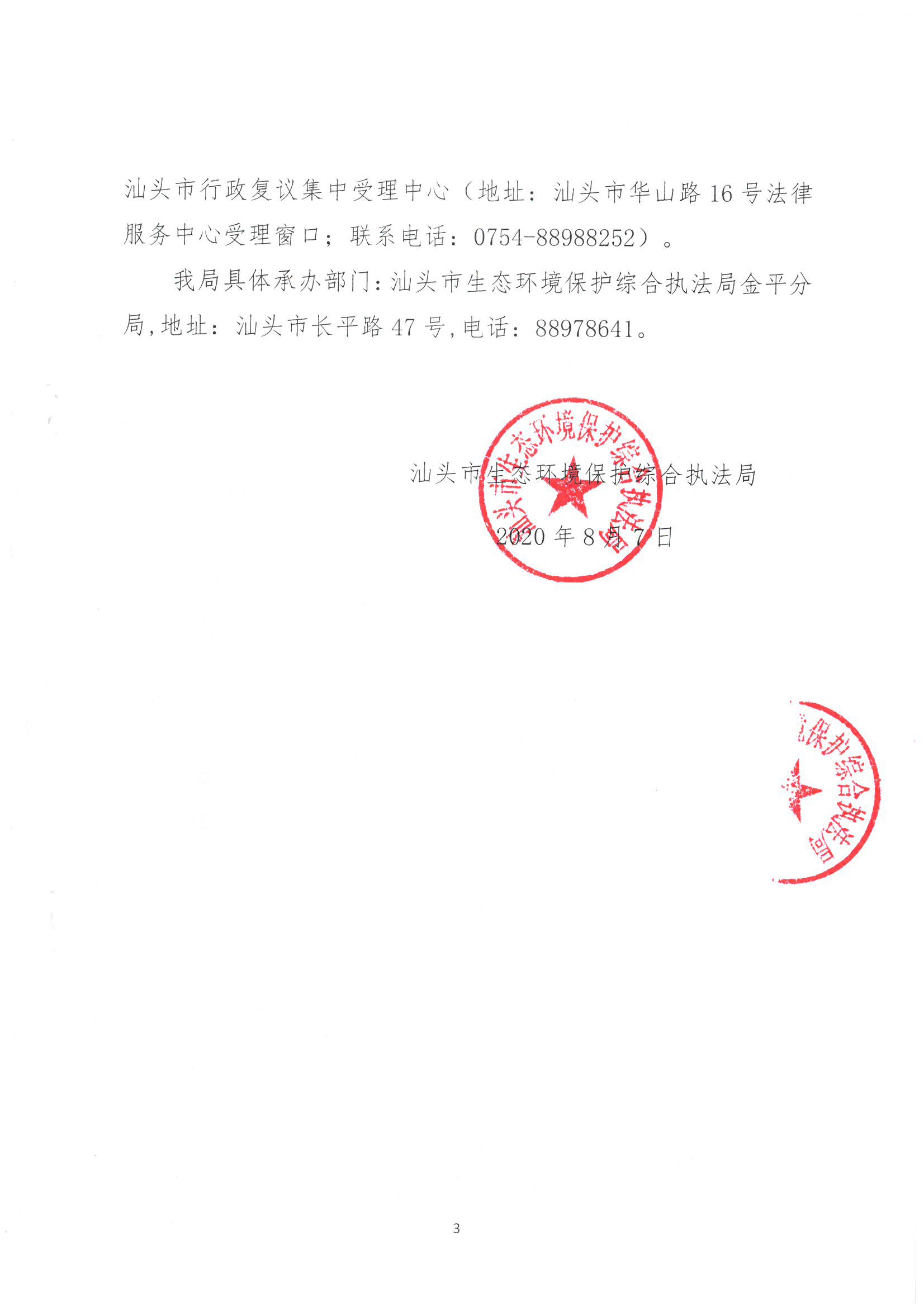 【金平】责令改正违法行为决定书(汕环执责改〔2020〕291号)
