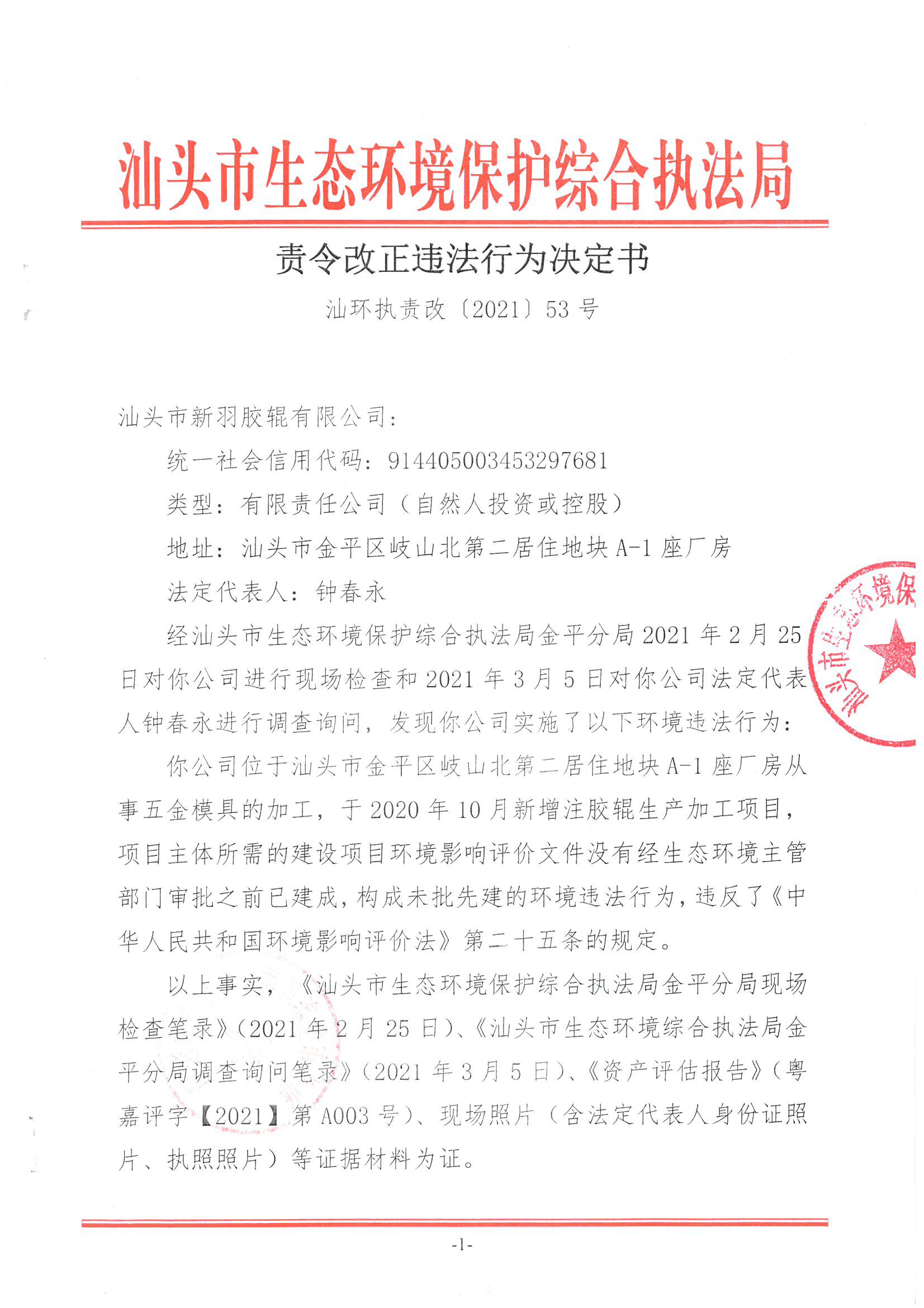 【金平】责令改正违法行为决定书(汕环执责改〔2021〕53号)