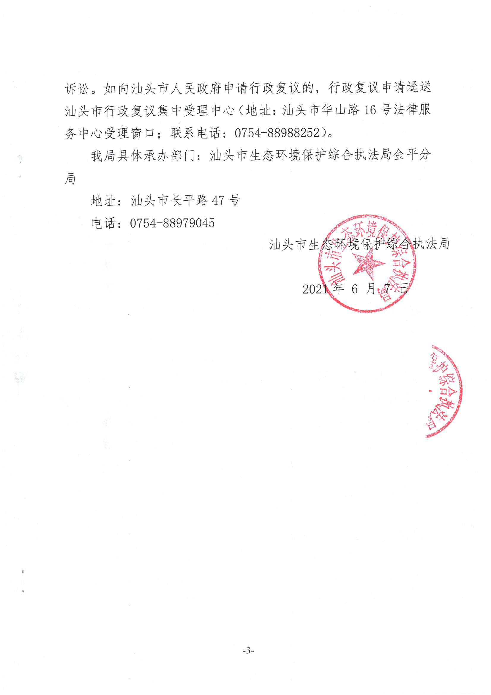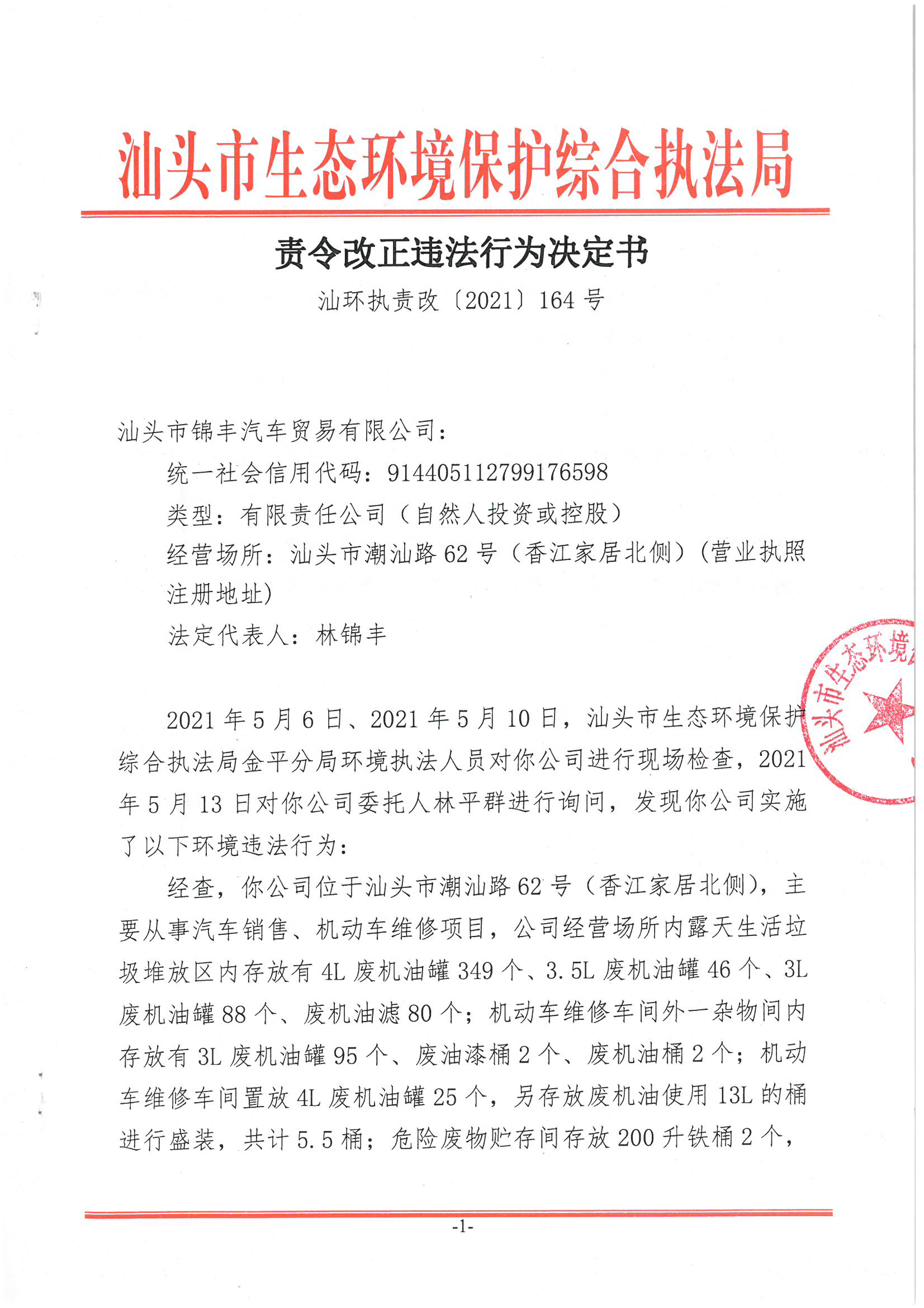 【金平】责令改正违法行为决定书(汕环执责改〔2021〕164号)