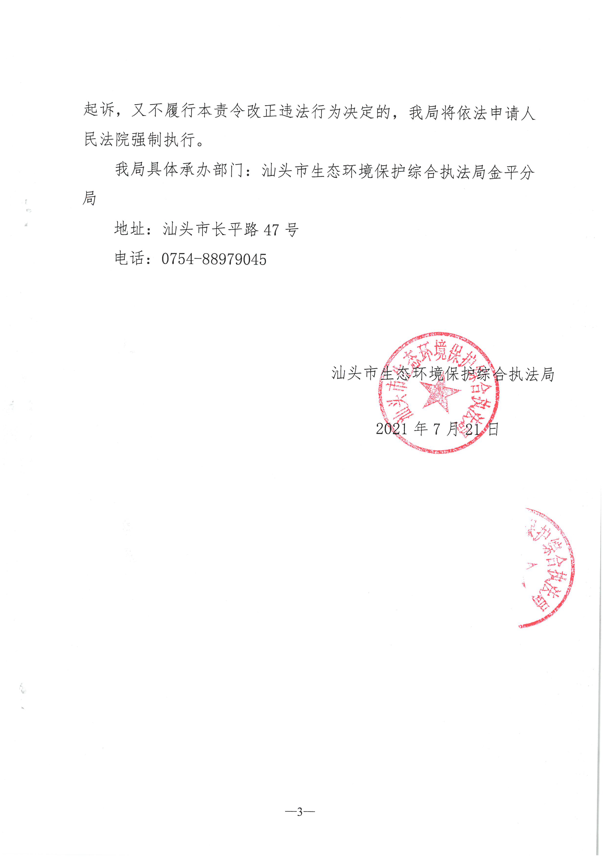 【金平】责令改正违法行为决定书(汕环执责改〔2021〕259号)