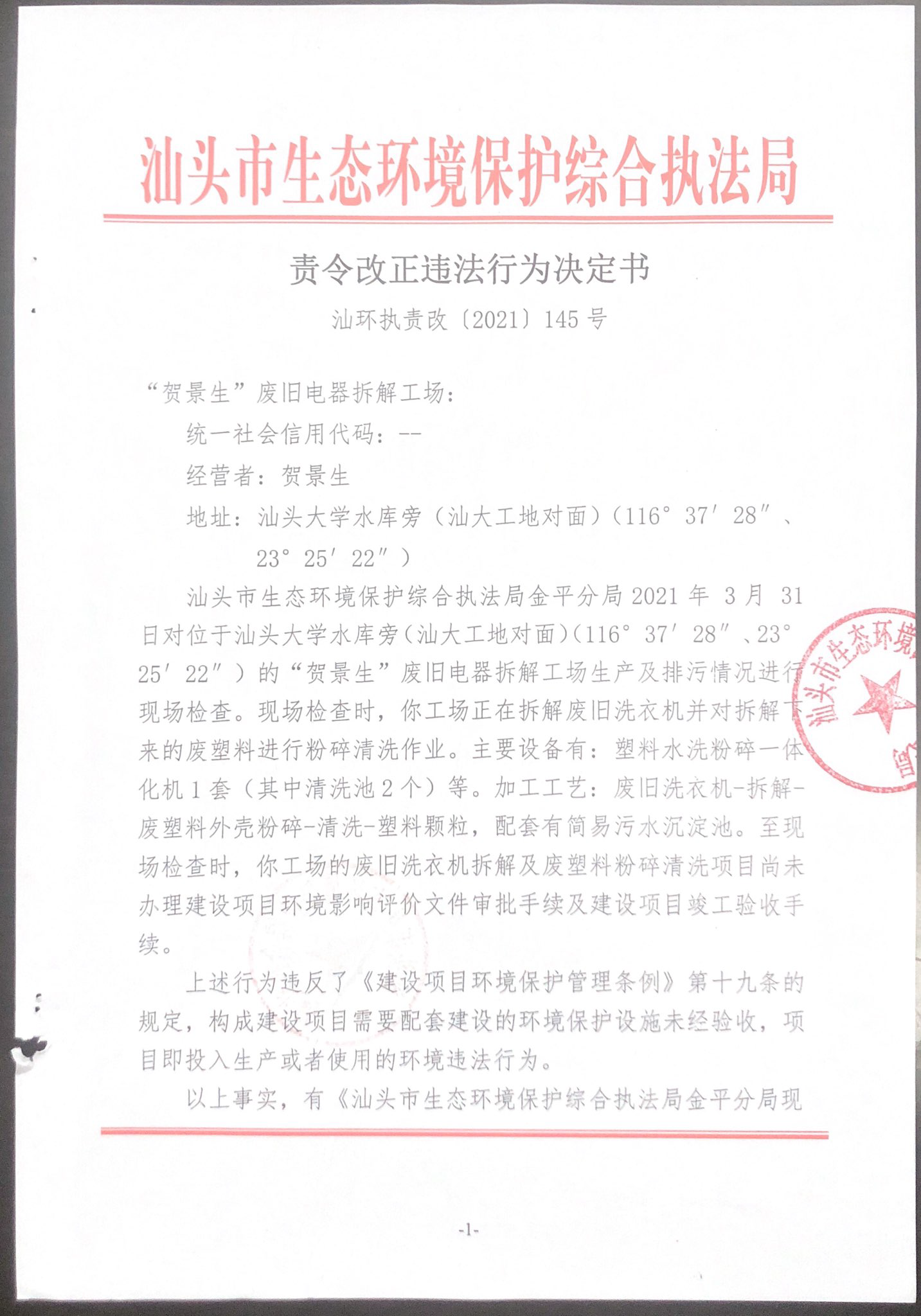 【金平】责令改正违法行为决定书(汕环执责改〔2021〕145号)