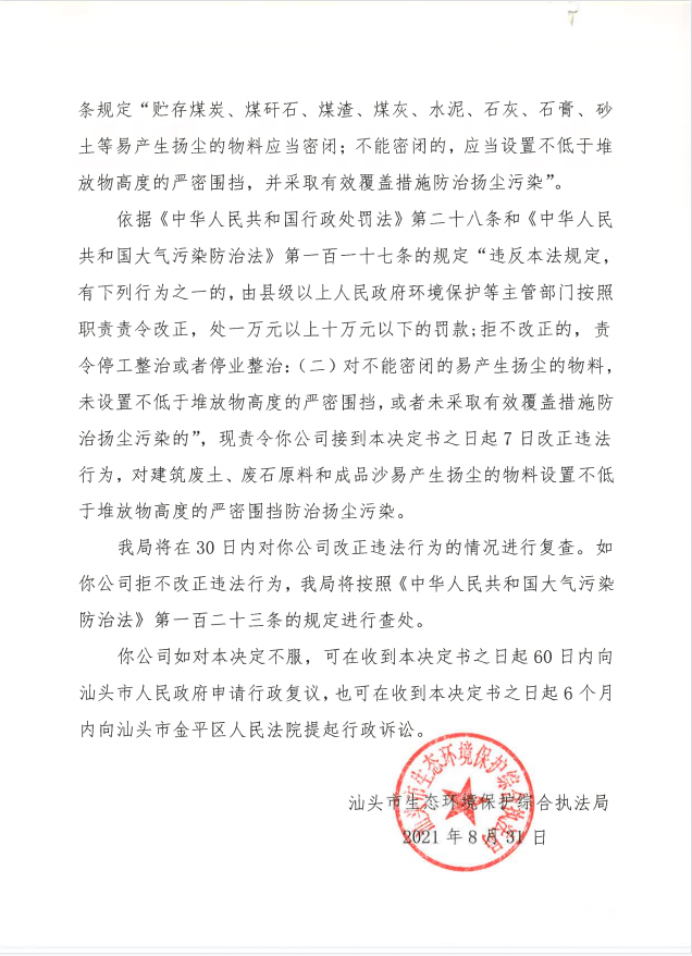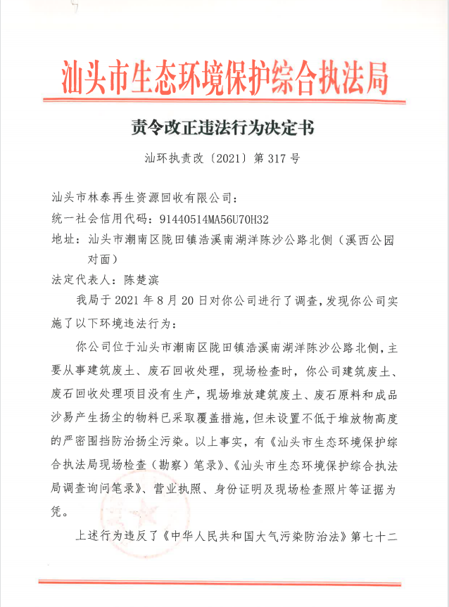 【潮南】责令改正违法行为决定书(汕环执责改〔2021〕317号)