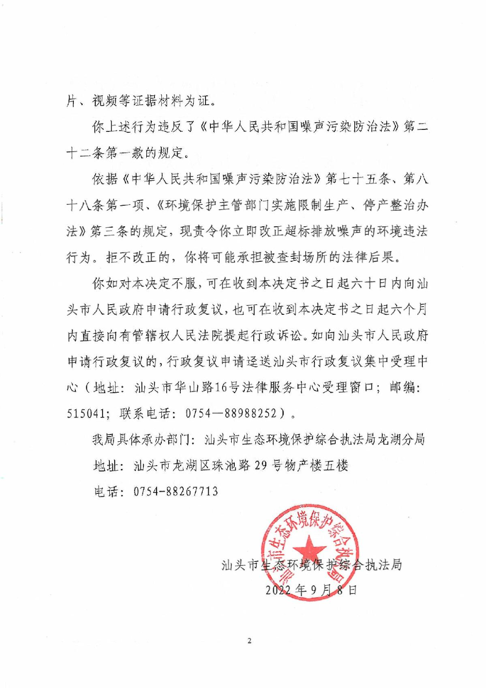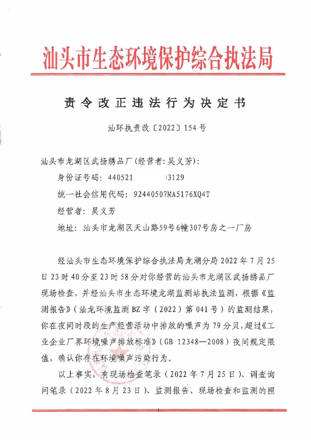 【龙湖】责令改正违法行为决定书(汕环执责改〔2022〕154号)