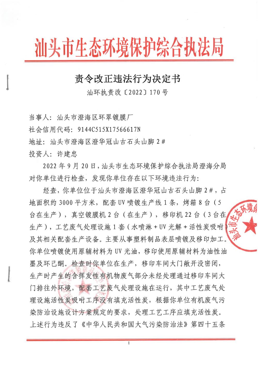 【澄海】责令改正违法行为决定书(汕环执责改〔2022〕170号)
