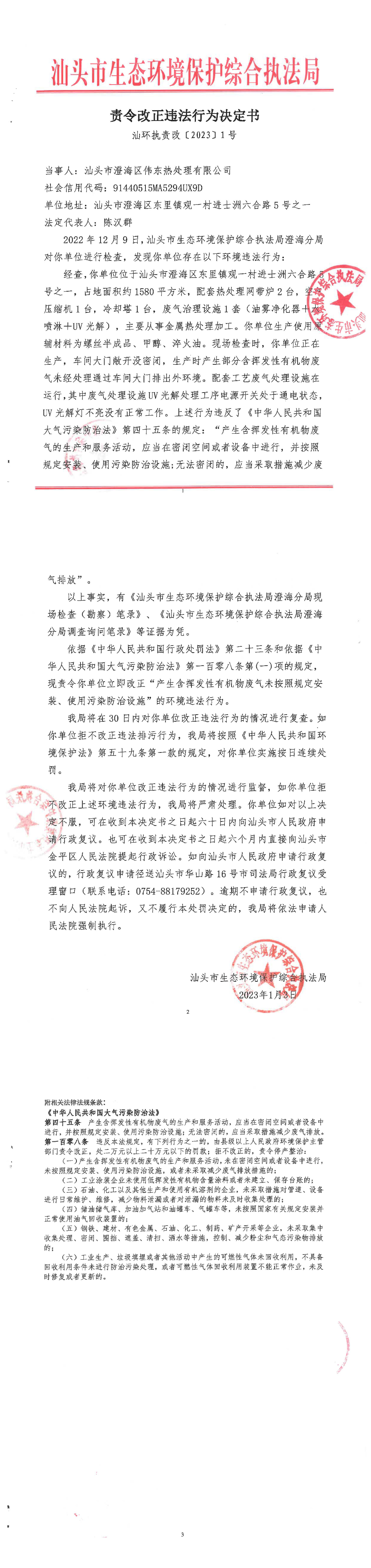 【澄海】责令改正违法行为决定书(汕环执责改〔2023〕1号)