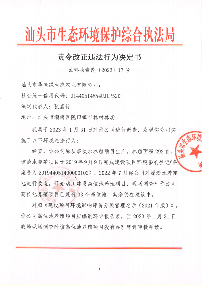 【潮南】责令改正违法行为决定书(汕环执责改〔2023〕17号)