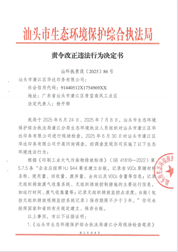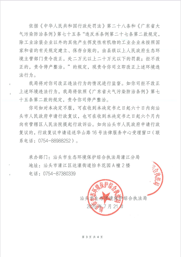 【濠江】责令改正违法行为决定书(汕环执责改〔2025〕86号)
