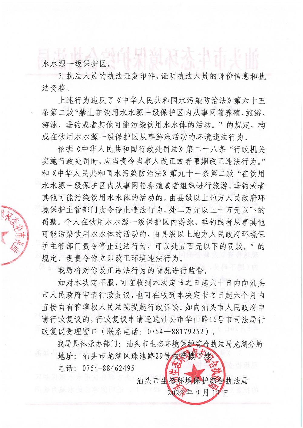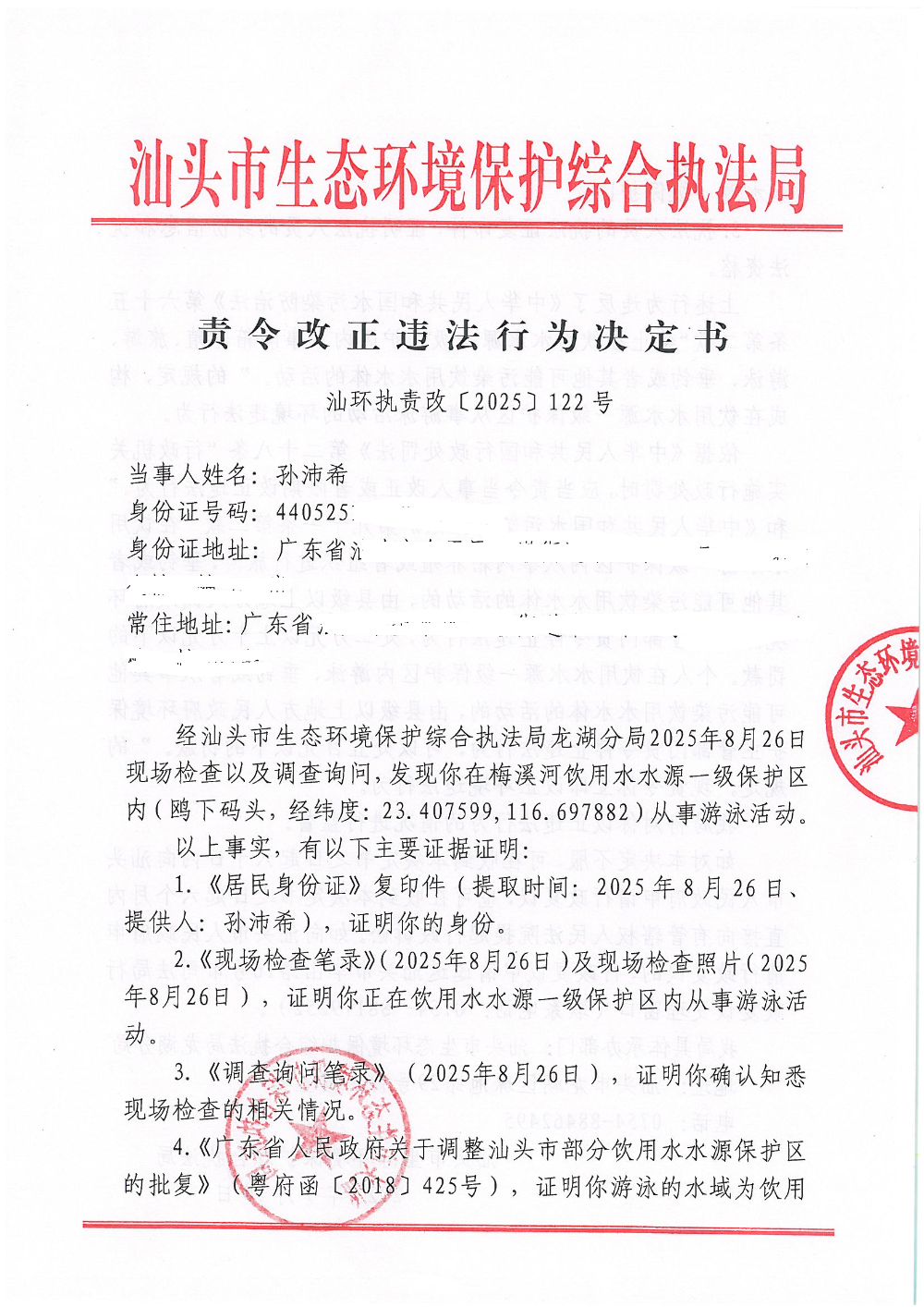【龙湖】责令改正违法行为决定书(汕环执责改〔2025〕122号)