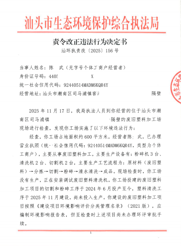 【潮南】责令改正违法行为决定书(汕环执责改〔2025〕156号)