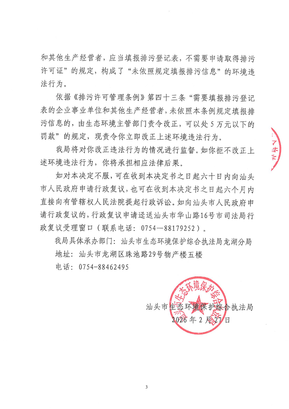 【龙湖】责令改正违法行为决定书(汕环执责改〔2026〕29号)