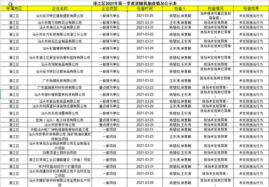 濠江区2021年第一季度双随机抽查情况公示表