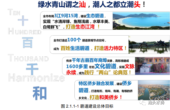 按照规划目标,今年我市将完成万里碧道市级试点建设准备工作。到2022年底,建成总长不少于190km碧道,成为汕头生态文明建设亮丽名片。 全力打造“三江九河百溪”的江河湖海水系碧道建设格局,实现“水清岸绿、鱼翔浅底,水草丰美、白鹭群飞”,打造全国唯一内海湾的生态江湾。三江即韩江、榕江、练江;九河即濠江、南溪、北溪、东溪、义丰溪、莲阳河、外砂河、新津河、梅溪河;百溪即峡山大溪、南山截流、五南沟以及小型河流等。 全力打造近100 个碧道景观节点,以河海统筹聚生态格局,串起、点亮自然人 文要素,以水脉聚人气、以湾区聚产业,吸引人们亲水、乐水、爱水、护水,凸显 具有以水为脉、以文为魂的内在活力。 全市打造800km碧道,着力加强生态保护治理、保障河湖长治久安、改善人民群众生活、保护传承弘扬潮汕文化,促进河湖流域及辐射区域的高质量发展,促进汕头建设粤东中心城市,让碧道成为造福人民的幸福碧道。 围绕侨乡文化,打造有形、有味、有魂、有根的侨乡文化,汇聚侨心,凝聚民心,有力促进特区侨乡融合发展,打造“望得见山、看得见水、记得住乡愁”的侨乡碧道。