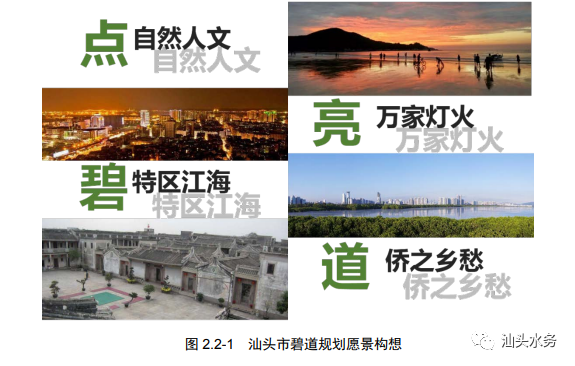 规划根据汕头市“一主、一带、两极、两翼”城市发展新格局,强化全国唯一内海湾的突出优势,以天然内海湾、蓝色海岸带、三江入海基本水系格局,着力构建“一带、一轴、两翼、三江、四区”总体布局,全面打造更好满足人民日益增长的美好生活需要的幸福碧道。 以粤港澳大湾区国家战略为契机,充分依托粤东海岸线优势与区位优势,贯通海岸线,对接粤港澳大湾区建设,促进汕头特区新发展,全力打造活力特区。 作为全国唯一独自拥有内海湾的城市,发展条件得天独厚,区域位置优越,高标准擘划内湾新区,打造宜业江湾(环江湾布设港口、外贸、工业园区)、宜居江湾(生态环境优良,生活生产便利)和生态江湾(牛田洋生态农业示范带),以此为发展轴、传动轴,有效带动金平、龙湖、潮阳、濠江的高质量发展。 两翼:努力实现高质量发展之翼,简称“发展之翼”;全面推进生态文明建设之翼,简称“生态之翼”。 充分利用汕头市三江入海格局,重点打造韩江、榕江、练江3大主要水系的碧道建设,构成三江生态廊道基本格局,并以三江为基础,建成总长超过800km幸福碧道。 以汕头幸福碧道建设,在可打通常的基础上,以水为脉络,统筹与组织沿岸各个区段的功能体系,融合汕头市全域特色资源和旅游发展总体布局,着力建设海滨都市休闲区、海岛森林度假区、生态侨乡游览区、千年古县体验区。