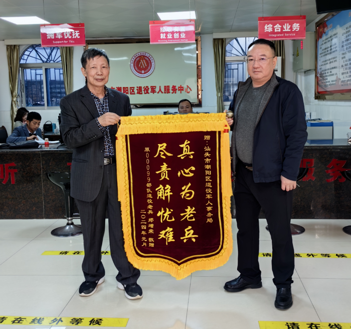 潮阳区退役军人事务局负责人表示,将以这面锦旗为鞭策,在今后的工作中,践行全心全意为退役军人服务的宗旨,坚持务实的作风,用心用情用力为退役军人办实事、解难题,扎实做好退役军人及其他优抚对象的服务保障工作,让广大退役军人真切体会到党和政府的关心和温暖。(潮阳区局供稿)