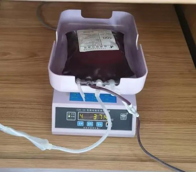 这台机器叫做电子采血秤。我们知道,当血液流出体外时,正常情况下2~8分钟就会凝固。但献血采集的血液在采血袋里却不会凝固,这得益于采血袋里的抗凝剂。