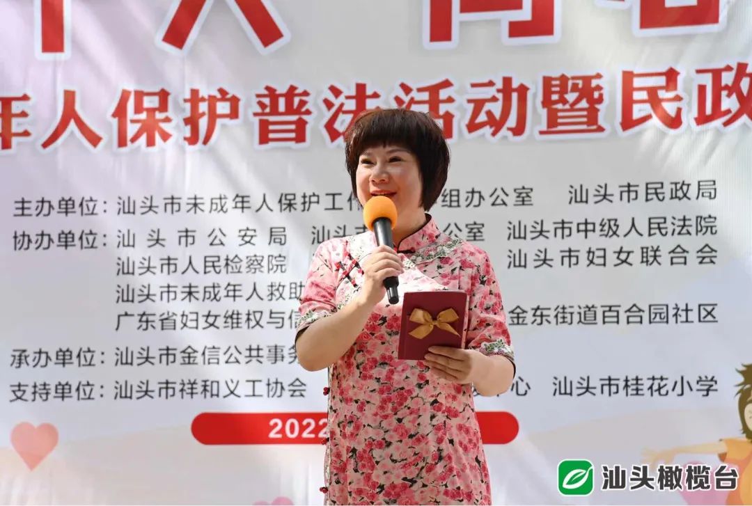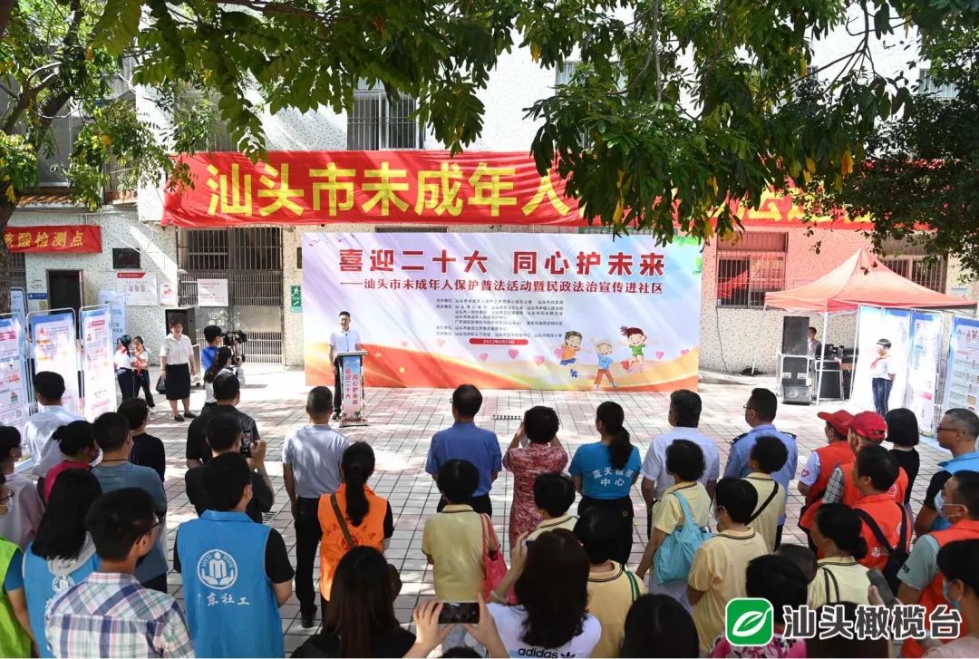 为进一步宣传贯彻《中华人民共和国未成年人保护法》、《预防未成年人犯罪法》、《家庭教育促进法》等法律宣传,在全社会营造关爱保护未成年人的良好氛围,24日上午,由市未保办、市民政局、市公安局、市普法办、市中级人民法院、市检察院、市卫健局、市妇联联合举办的“喜迎二十大,同心护未来——汕头市未成年人保护普法活动暨民政法治宣传进社区”在金东街道百合园社区举行。