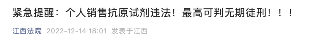 12月14日,江西省高院提醒,个人不能从事第三类医疗器械(包括第二类)经营活动,个人在朋友圈等网络平台销售新冠抗原试剂盒是违法行为。如果试剂出现造假、以不合格产品冒充合格产品,情节严重的可判处无期徒刑。