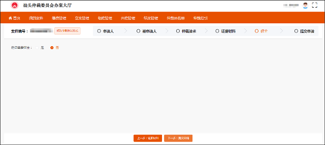 四、分步输入申请人、被申请人、仲裁请求、证据材料等信息,并上传仲裁申请书与其他材料。输入上述案件信息后,点击“下一步:提交申请”完成申请立案预审核信息的提交。