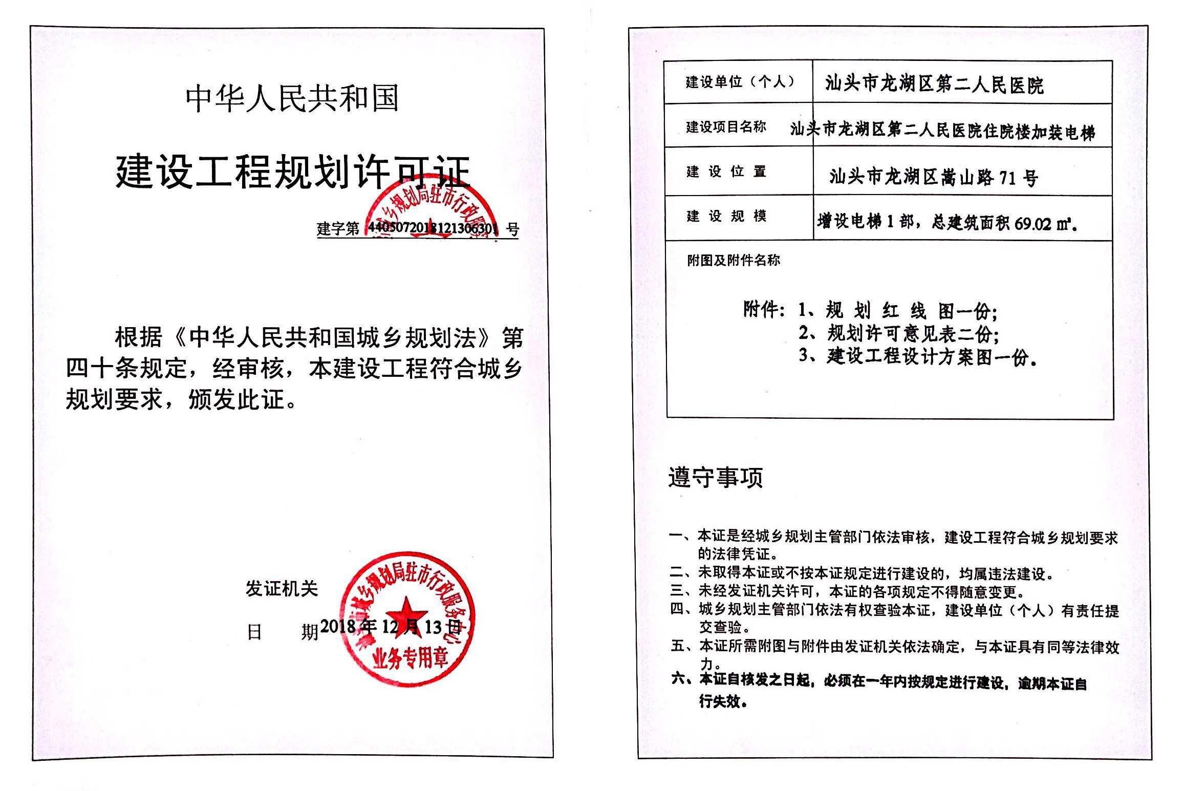 汕头市龙湖区第二人民医院汕头市龙湖区嵩山路71号汕头市龙湖区第二人民医院住院楼加装电梯项目《建设工程规划许可证》批后公告