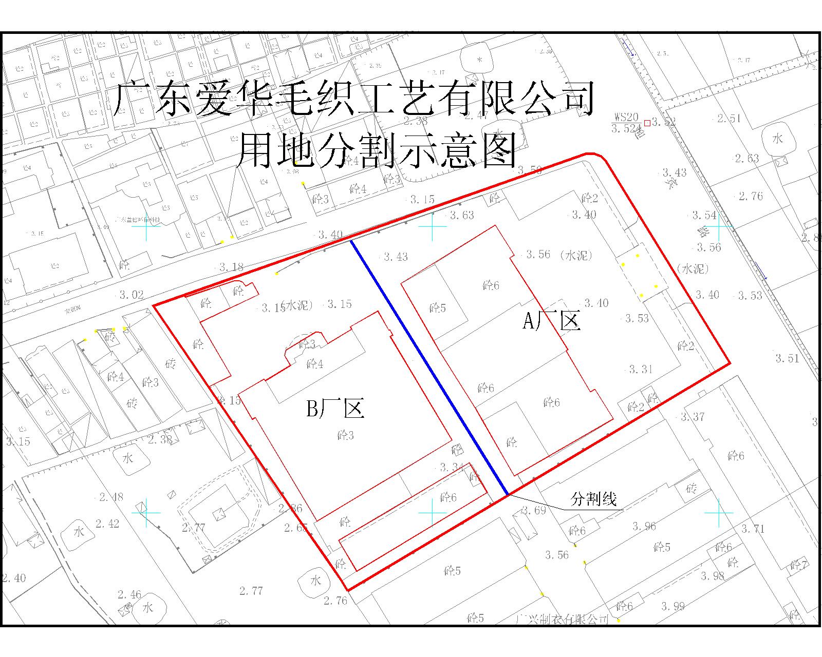 用地分割内容:申请将广东爱华毛织工艺有限公司用地沿A、B厂区的中间线分割(详见附图)