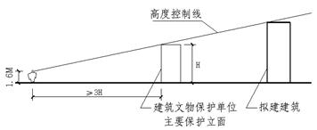根据优秀历史建筑和文物保护单位的周围环境,选择适当视点确定视线走廊,进行视线分析。视点的距离应大于或等于3H,且其视角不小于60度。因现状条件限制难以按3H视点距离控制高度的,视点距离可适当缩小,但不得小于2H。