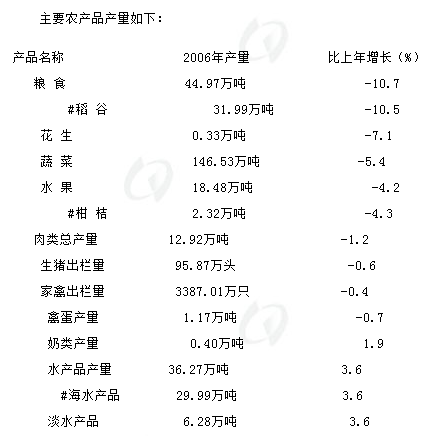 农业和农村经济稳步发展。农业基础地位进一步加强,社会主义新农村建设扎实推进。农业生产克服了台风等不利因素的影响,继续保持稳定。全年农业增加值43.56亿元,比上年下降3.9%;农业总产值84.23亿元,下降0.7%。