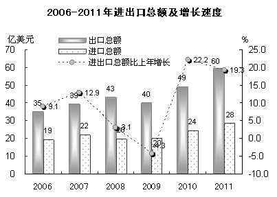 据海关统计,2011年全市进出口总额87.88亿美元,比上年增长19.3%。其中,进口总额28.35亿美元,增长16.6%;出口总额59.54亿美元,增长20.7%。在出口总额中,一般贸易出口43.80亿美元,增长22.6%;加工贸易出口15.56亿美元,增长15.5%。从经济类型看,国有企业出口3.36亿美元,增长9.0%;集体企业出口1.38亿美元,增长10.6%;外商投资企业出口22.83亿美元,增长10.1%;私营企业出口31.61亿美元,增长32.1%。从出口商品看,机电产品出口14.71亿美元,增长14.6%;服装出口14.21亿美元,增长21.4%;玩具出口8.64亿美元,增长29.5%;塑料制品出口2.51亿美元,增长38.6%;高新技术产品出口3.83亿美元,增长8.5%。从进出口的国家与地区看,进出口总额靠前的有:美国、香港、日本和台湾,分别为12.06亿美元、10.54亿美元、6.77亿美元和2.98亿美元,合计进出口额占全市总计的36.8%,同比下降2.5个百分点。