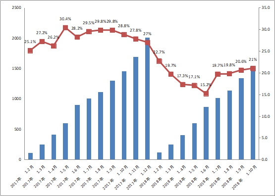 2018年1-10月,我市固定资产投资同比增长21.0%,高于全省水平10.8个百分点。其中:项目投资同比增长20.2%;房地产开发投资同比增长23.8%。