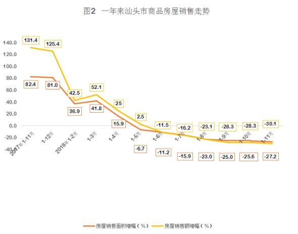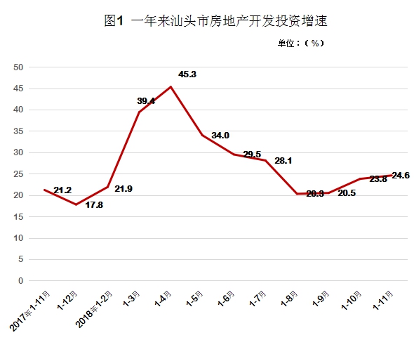 2018年1-11月,汕头市房地产开发投资同比增长24.6%。其中,住宅投资增长32.2%。住宅投资占房地产开发投资的比重为64.9%。