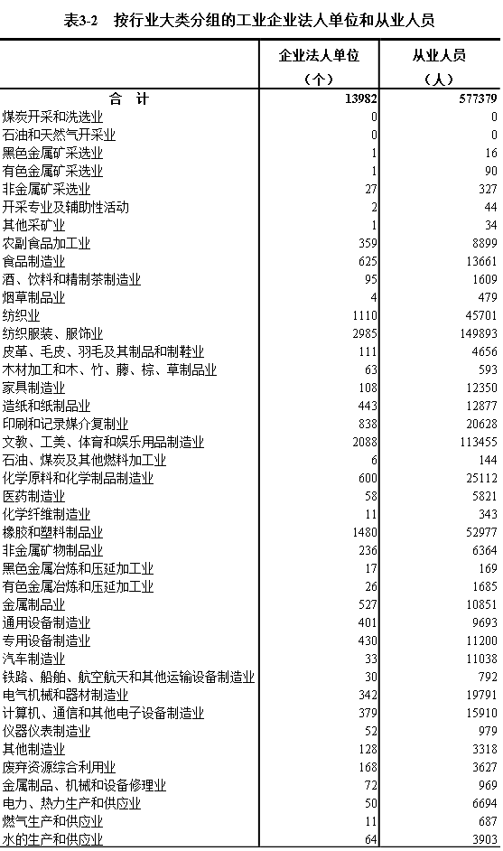 在工业企业法人单位中,采矿业32个,制造业13825个,电力、热力、燃气及水生产和供应业125个,分别占0.2%、98.9%和0.9%。在工业行业大类中,纺织服装、服饰业、文教、工美、体育和娱乐用品制造业、橡胶和塑料制品业企业法人单位数位居前三位,分别占21.3%、14.9%和10.6%。