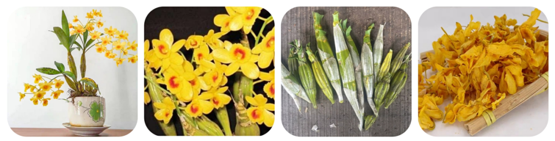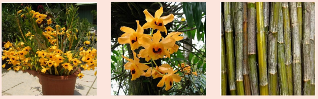 金钗石斛:又名金钗花,呈扁圆柱形,表面金黄色或黄中带绿,有深纵沟。质硬而脆,断面较平坦而疏松。气微,味苦